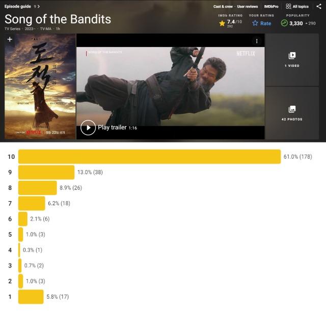 このドラマは、韓国がまだ日本の植民地支配下にあった頃の盗賊の冒険を描いたエキサイティングなものだ。山賊たちは、自分たちの土地、家族、友人を守るためなら、命さえも賭ける覚悟がある。盗賊たちは、自分たちにとって貴重なものすべてを守るために集まって戦う。この行動は馬に乗り、砂嵐の砂漠を横断することで実行される。撮影に関しては、かなり目を楽しませてくれる。ストーリーはアクションシーンがあるのでエキサイティングだし、各エピソードのストーリーも退屈しない。私見だが、闘争を描いたアクションドラマが好きな人にはいい番組だと思う。